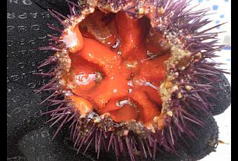 Con un cuchillo, con mucho cuidado voy quitando todo lo que encuentro entre las gónadas anaranjadas y lo enjuego cuidadosamente con agua del mar.