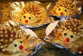 Preparación1.Desmenuzamos el bizcocho y los mezclamos con 500g de almendra y almíbar. Con la masa obtenida hacemos la forma de los erizos (forma como de gota).2.Ponemos cada erizo sobre un trozo de papel de aluminio para no manchar.3.Con una brocha pintamos los erizos con una pasta de mantequilla y azúcar glass.4.Con papel de cocina tapamos el morro y lo demás lo espolvoreamos con canela molida.5.Clavamos almendras fileteadas como puas, dos conguitos los ojos, una cereza en la nariz y listos.6.Hay que dejarlos reposar dos dias, y el papel de plata es mejor no quitarlo hasta entonces para que no se rompan.