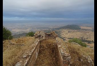 Arriba: desde el punto más álgido del Cerro de San Serván, a unos 608 metros de altitud, los restos de la Ermita de los Mártires San Servando y San Germán se yerguen sobre el lugar donde, según la tradición, buscaron refugio y retiro eremita los santos hermanos emeritenses cuya presencia en esta serranía daría no sólo nombre a la misma, sino también al municipio en cuyo término municipal se ubica, antiguo Arroyo de Mérida y actual Arroyo de San Serván.