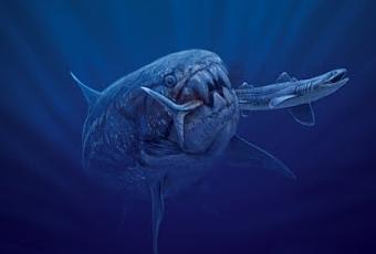 Dunkleosteus cenándose a un Cladoselache (un condrictio primitivo). Y no, esos "dientes" son en realidad placas mandibulares (infra y supragnatales). Arte de Julius Csotonyi.Y cuando se comenzaron a descubrir en más y más grupos, algo quedó claro: los dientes de los placodermos, los primeros "peces" mandibulados, se perdían fácilmente y no se solían preservar. Éstos estaban por lo general, dispuestos en placas dentales ubicadas en el borde de la mandíbula.