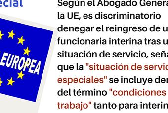 Según el Abogado General de UE, es discriminatorio denegar el reingreso de una funcionaria interina tras una situación de servicio señala que la "situación de servicios especiales" se incluye dentro del término "condiciones de trabajo" tanto para interinos como para funcionarios de carrera y por tanto denegar el derecho de la funcionaria interina a ocupar su puesto de trabajo una vez terminado el servicio especial es discriminatorio.