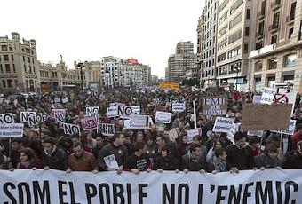 “Somos el pueblo, no el enemigo”, decía la pancarta exhibida en la cabecera de una manifestación el miércoles pasado. Tuvo lugar en el centro de Valencia con la participación de más diez mil personas. La marcha protestaba por las cargas policiales de los últimos días que se saldaron con 41 personas detenidas, seis de ellos menores. Además de la dimisión de la delegada del Gobierno (Paula Sánchez de León) y del Jefe superior de Policía en la Comunidad Valenciana (Antonio Moreno), se pedía que se acabasen los recortes en Educación. Era la tercera jornada consecutiva de lucha estudiantil. Partidos de izquierda y sindicatos se organizaron en la Plataforma unitaria de organizaciones políticas, sociales y sindicales, repitiendo uno de los lemas más coreados: “Sánchez de León, dimisión” y “Somos estudiantes, no delincuentes”. Dos horas tardaron en recorrer apenas 700 metros que separan el Instituto Lluis Vives de la Delegación del Gobierno. Se exhibieron pancartas de protesta: “Más educación, menos violencia”, “El enemigo es la porra”, “Con grises, hoy azules, Franco ha muerto”, “El abuso policial es dos veces criminal”. Los estudiantes planearon otras acciones de protesta en las que exigieron más inversión en Educación. “No tenemos material, las ventanas se rompen y no las arreglan, el techo se cae a trozos, no hay dinero para fotocopias y las bajas de profesores tardan meses en cubrirse –se quejaban–. Queremos igualdad de oportunidades con los de la privada y la concertada”. Y acordaron rodear el Lluís Vives con libros en la mano, pero sin cortar el tráfico.