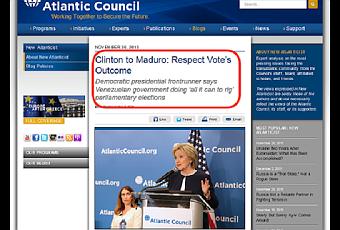 1. Hillary Clinton apuntó hacia cantar fraude en una reunión del think tank "Atlantic Council" de la derecha estadounidense que gestiona diez centros regionales, que en este caso financió Exxon Mobil, Chevron y la armamentista Lockheed Martin. Su afirmación es elocuente: "Venezuela vota este fin de semana. Debemos asegurarnos de que se respeta la voluntad del pueblo. Y la responsabilidad comienza por la administración de Maduro, que hasta ahora ha intentado amañar las elecciones". (“As the people of Venezuela go the ballot box this weekend, it is really up to all of us in this hemisphere to ensure their will is respected, and that responsibility begins with the Maduro administration,” Clinton said, “which to date has been doing all it can to rig these elections.”) [3]