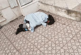 Lo he visto cuando iba camino del bar. Tirado en la calle. Inmóvil. A plena luz del sol. Al pasar por su lado un fuerte olor a mugre mezclada con orín me ha obligado a taparme la nariz. Eran las 10:32 de la mañana y yo sólo pensaba en mi café. Soy culpable. Le he robado esta foto sin preguntar.