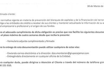 Os ponemos en antecedentes, en la pasada semana los clientes de Cajamar, han recibido bien a través de su cuenta de banca electrónica, bien en papel (o por ambos cauces a la vez) una petición de información de este banco que les requiere entregar so pena de ver cerradas o invalidadas sus cuentas. De entrada, encontrarte esto en el buzón sin que haya mediado ninguna otra información por parte del banco previamente, es tener una enorme falta de tacto, sobre todo con determinados clientes. Y máxime si pensamos en lo mucho que se da información en otros momentos cualquier promoción comercial, recientemente de un parasol para el coche. ¿No cabe pensar que los clientes valorarán mucho mas esa atención en forma de información para saber el por qué de esta inusual e “importante” petición?