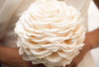 Si además tiene un acabado con cristales Swaroski tanto en los propios pétalos como en el tallo envuelto por gasa, seda o tafetán, en conjunto con el vestido de novia, el resultado es así de hermoso...