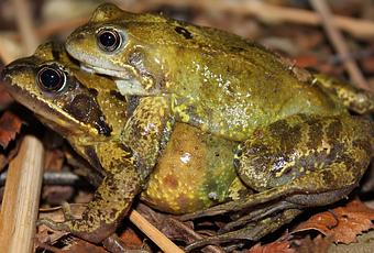 Pareja de ranas bermejas (Rana temporaria) en amplexo.