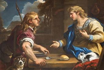 Un día, cuando Jacob estaba preparando un guiso, Esaú llegó agotado del campo y le pidió de comer. Jacob le solicitó a cambio su renuncia a los derechos aparejados a la primogenitura, a lo que Esaú acepto bajo juramento. Es pintura que revela las excelentes dotes de narrador de su autor. La escena se desarrolla en un interior, aunque la figura de Esaú se recorta sobre una ventana que muestra el paisaje del que procede, al tiempo que lo caracteriza como un personaje popular. A ello alude también su musculatura visible en su brazo derecho, situado en el plano más próximo al espectador, así como el perro y la lanza, que muestran su actividad venatoria.