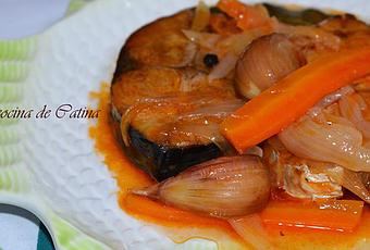 Un kgr de bonitouna cebollauna zanahoria8 dientes de ajo enteros con piel20 granos de pimienta negra3 hojas de laurelun vaso de aceite de olivauna cucharadita de pimentón1/3 de vaso de vinagre de Jerezsalun vaso de aguaPreparación: