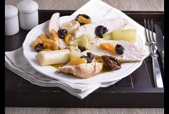 Para terminar, fileteamos el pavo, lo acompañamos de la verdura y las frutas y salseamos con el escabeche. Servimos.