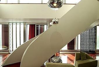 Esta escalera de lineas curvas, suaves y hasta sutiles, pertenece a una lujosa residencia en Beijin. Es apenas una muestra de la casa cuyo interior tiene muy pocas esquinas en ángulo, casi todo está definido con curvas y ondulaciones. El interior de esta casa es realmente fantástico, puede verlo en el link agregado más abajo. Para comparar con otras escaleras siga este vínculo, hay una lista de posteos relevantes.