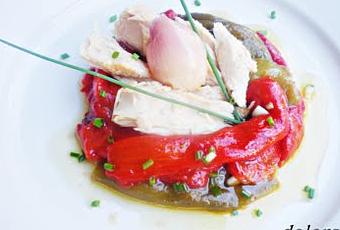 En el plato de servir colocar las tiras de pimiento alternando los dos colores y dándole una forma circular, colocar un buen trozo de ventresca en el centro y un trozo de cebolla asada.
