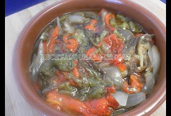 Dos berenjenas, un pimiento rojo, un pimiento verde, 2 tomates, 2 cebollas, aceite de oliva, sal.