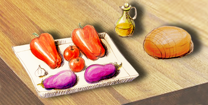 (para 4 personas)4 pimientos rojos grandes1 cebolla grande1 berenjena grande2 tomates medianos3 dientes de ajo (uno para untar el pan)1 lata o tarro de anchoas de alta calidadAceite de oliva virgenVinagreSal y pimientaUna hogaza de pan rústico