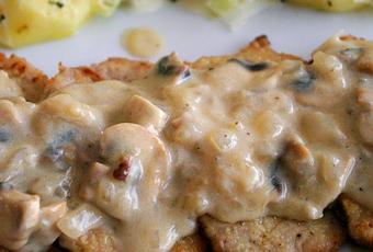 Servir los escalopines salseados con la crema de champiñones y acompañados de las patatas gratinadas con su salsa.