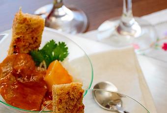 Presentar el aperitivo en un vaso o plato pequeño individual, poniendo un poco del arroz, un poco del guiso con su salsa y por último una tira de pan tostado y unas hojas de cilantro.