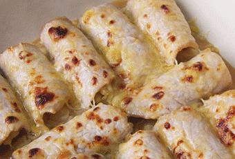 Vertemos la salsa sobre los escalopines enrollados y espolvoreamos con queso rallado.