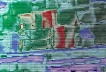 Se observaron en todos los monumentos diversas anomalías térmicas, pero una de ellas, especialmente llamativa, se detectó a nivel del suelo en la cara este de la Gran Pirámide, también conocida como Pirámide de Khufu o Keops. Fotografía: Philippe Bourseiller / HIP Institute, Facultad de Ingeniería de El Cairo / Ministerio de Antigüedades.