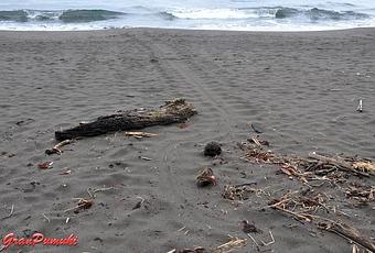 Nosotros estábamos a unos 20 minutos a pié del pueblo, por lo que decidimos acercarnos por la playa. Ahí empezó nuestro contacto "virtual" con las tortugas, con su rastro. Eran evidentes las marcas de entre medio metro y un metro de ancho que habían dejado la noche anterior las tortugas (tortuga verde en esta época del año, agosto). Las marcas llegaban desde cerca de la orilla, donde las olas no las habían borrado hasta el final, cerca de los matorrales. Allí, se podía observar el falso nido que construyen cerca del verdadero para despistar y proteger los huevos. Os cuento mi experiencia en El Desove de las Tortugas en Tortuguero.