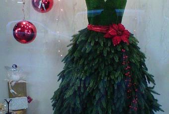 Si tienes una tienda y no te ha dado tiempo a poner nada especial en tu escaparate, mira que idea más bonita, es un árbol de navidad lo que es la falda y la parte de arriba está hecho con cesped artificial, para adornar un lazo rojo y unas bolas que cuelgan del techo.