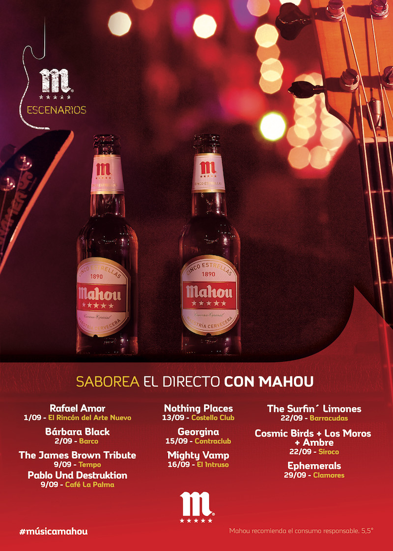 Además, el primer fin de semana de septiembre, también arranca el Festival Gigante en Guadalajara, donde el publico podrá disfrutar en Beerbena Mahou de exclusivos conciertos en acústico de artistas como Juan Zelada, Embusteros, Bambikina y Lichis. Horarios conciertos Beerbena Mahou Festival Gigante:Viernes 1 septiembreSábado 2 septiembreCon estas iniciativas Mahou sigue apostando por una de sus pasiones, apoyar la música y compartir experiencias únicas que acercan a las personas a sus artistas favoritos. Además de impulsar festivales como Mad Cool o Gigante, la marca también apoya a nuevos talentos y a artistas consagrados de distintos géneros musicales para que tanto madrileños como visitantes disfruten de los diferentes planes de ocio que se ofrecen en los fines de semana en la ciudad.#músicaMahou#EscenariosMahouMás información enhttp://www.mahou.es/ocio/musica/escenarios/Sobre MahouMahou es una familia de cervezas nacida en la calle Amaniel de Madrid en 1890.Es el resultado del trabajo de pioneros y maestros cerveceros que, desde hace más de 125 años, buscan compartir sabores y nuevas experiencias.Mahou desarrolla la cultura cervecera basándose en rigurosos procesos de calidad y en los mejores ingredientes para dar a sus productos un sabor inconfundible.La experiencia, la pasión y la calidad han convertido a Mahou en una gran familia de cervezas con un amplio portafolio de marcas como Clásica, Cinco Estrellas, Sin, Maestra, Barrica, Casimiro Mahou, Sin Gluten, Limón…Sobre Mahou San MiguelCompañía familiar 100% española, líder del sector cervecero en nuestro país con una cuota de producción del 34%. Dispone de ocho centros de elaboración de cerveza –siete en España y uno en India–, tres manantiales de agua con sus plantas de envasado y un equipo de más 2.800 profesionales.Cuenta con más de 125 años de historia, que comienzan con el nacimiento de Mahou en 1890. Desde entonces, la empresa no ha parado de crecer. En el año 2000, Mahou adquiere San Miguel. En 2004, incorpora la marca canaria Reina y, en 2007, Cervezas Alhambra. Además, ha diversificado su negocio con la compra en 2011 de Solán de Cabras.Posee un amplio portafolio de cervezas nacionales donde destacan, entre otras, Mahou Cinco Estrellas, San Miguel Especial y Alhambra Reserva 1925; productos pioneros en su categoría, como San Miguel 0,0, San Miguel 0,0 Isotónica y San Miguel ECO, y marcas aptas para celiacos como San Miguel Gluten Free y Mahou Cinco Estrellas Sin Gluten. También tiene una amplia gama de cervezas internacionales, fruto de acuerdos con partners como Carlsberg y Warsteiner, y marcas de agua como Solán de Cabras.La internacionalización es uno de los ejes estratégicos para el desarrollo de su negocio. Produce más del 70% de la cerveza española que se consume en el mundo y está presente en más de 70 países