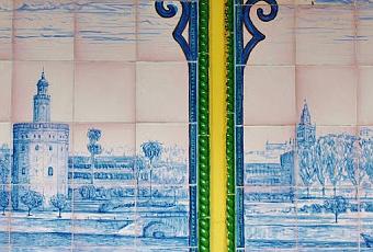 Sobre la fachada del Restaurante Sevilla II en la concurrida Calle Marqués de Paradas nos encontramos con unos azulejos con escenas típicamente sevillanas. Por un lado el río Guadalquivir, su ribera, sus barcazas, la Torre del Oro e, incluso, se vislumbra la Giralda a lo lejos.