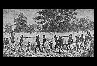 Esclavos africanosLa esclavitud fue una realidad hasta el siglo XIX, cuando la noción de 'derechos humanos' empezaba a llegar a las leyes escritas. Dinamarca fue, en 1792, el primer país europeo en prohibir la importación de esclavos. Este dibujo muestra a unos esclavos africanos unidos por el cuello, como animales de carga.