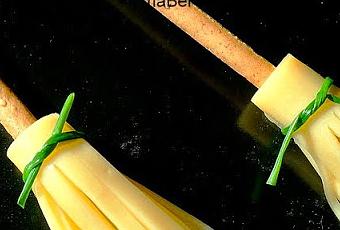 3.- Las lonchas de queso, las corto por la mitad, por lo que una sola loncha me alcanza para 2 escobitas. Lo mismo hago con los palitos de pan. Yo los compro, los mas finitos que hay en el mercado, y usé los tipo integral porque me venían muy bien. Si quieres hacer los palitos en casa, te dejo esta receta de grissini (ver receta)