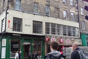 Por desgracia, la cafetería Nicolson, que estaba situada en la segunda planta del edificio esquina de Drummond St con Nicolson St ya no existe. En su lugar hay un restaurante llamado "Spoon" que, de momento, no parece querer aprovechar el tirón de su famosa historia. De hecho, el único homenaje a la saga que encontré fue esta pequeña placa situada en la fachada....