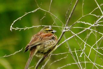La hembra es más discreta y difícil de distinguir del otro escribano, aunque las marcas faciales también están algo más marcadas.