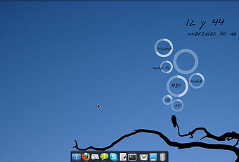 Hola. Tomando uno de los fondos de pantalla que vendrán con Natty, hice esta configuración de conky para simular el pensamiento del pajarito. El círculo que no muestra ninguna información es la batería que también tiene un texto donde muestra el tiempo restante, ahora no tiene la batería. El aspecto desprolijo es intencional dando la impresión que tiene muchas cosas en la cabeza.