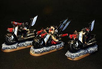 Como ya indiqué ayer, he terminado de pintar las miniaturas de los motoristas del Ala del Cuervo que vienen en la caja de Warhammer 40000: Venganza Oscura. La pintura de las motos se me ha hecho un poco pesada, no me acaban de convencer las motos, pero al menos están terminadas. Desde luego no con el nivel de las anteriores pero bueno. Son tres motos que componen la Escuadra Arión: