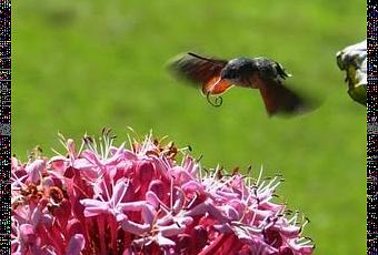 Esfinge colibrí (Macroglossum stellatarum)La esfinge colibrí es de color parduzco, menos acusado en la zona ventral y casi blanco debajo de la cabeza. El reverso de las alas y la parte final del anverso de las mismas presentan un hermoso y brillante tinte anaranjado y la cola manchas negras y blancas. Presenta gran preferencia por las flores de cáliz largo y estrecho, a las que puede llegar con su larga y especializada trompa.