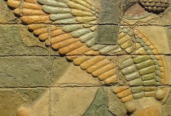 Esfinges.Esfinges.  Esfinges. med: 35x52x3 cm. Estos paneles de ladrillo vidriado polícromo del palacio de Darío I en Susa. de la dinastía aqueménida persa. Siglo V a.C., son dos esfinges con cuerpo de león alado y cabeza humana.Animales con cabeza humana, hiciero su aparición en el periodo neo-sumerio, posteriormente en relieves dinásticos en forma de toros con cabeza humana. Estas esfinges, deidades guardianas, llevan un tocado divino, sus expresiones serenas y benevolentes, confirman su condición como espíritus benéficos.Inspiradas en el canon real, más idealizado que realista, conforme a los estereotipos establecidos en todos los relieves de ladrillo en Susa, y en los relieves de piedra de Persépolis, como imágen de la grandeza del imperio.