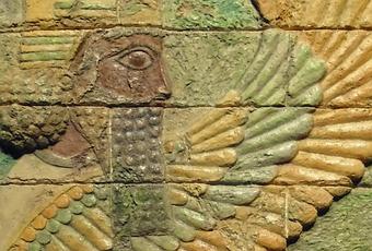 Estos paneles de ladrillo vidriado polícromo del palacio de Darío I en Susa. de la dinastía aqueménida persa. Siglo V a.C., son dos esfinges con cuerpo de león alado y cabeza humana. Animales con cabeza humana, hiciero su aparición en el periodo neo-sumerio, posteriormente en relieves dinásticos en forma de toros con cabeza humana. Estas esfinges, deidades guardianas, llevan un tocado divino, sus expresiones serenas y benevolentes, confirman su condición como espíritus benéficos. Inspiradas en el canon real, más idealizado que realista, conforme a los estereotipos establecidos en todos los relieves de ladrillo en Susa, y en los relieves de piedra de Persépolis, como imágen de la grandeza del imperio.
