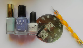 ...y también recordé que tenía un corazón similar en una de mis placas así que decidí hacer una propuesta que combinase con ella, con ese toque romántico que la caracteriza. En las uñas pulgar y corazón apliqué un azulón más intenso, el Bluebell de LOLA y sobre él estampé en blanco un corazón similar al de la prenda. Con el punzón y el Menthe Glacé, hice topitos alrededor del mismo.