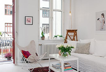 Embobados nos hemos quedado con este pequeño apartamento lleno de luz y objetos en tonos vibrantes. Tan natural y espontáneo que casi llega a resultar monótono y sin embargo la dulzura y el tesón con el que ha sido decorado hace que que uno se sienta como en su propia casa. La distribución es muy acogedora y práctica puesto que salón y dormitorio comparten la misma estancia. Pocas piezas pero muy bien seleccionadas, entre las que destaca una antigua vitrina de madera, varias maletas vintage que sirven para mantener el orden y una estantería que cumple la función de cabezal. Entre las piezas que destacaríamos se encuentra el kilim que descansa en la sala de estar, contrastando con los textiles en claras tonalidades.