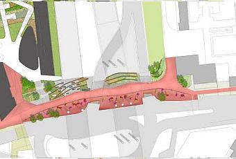 El proyecto ha involucrado la radical rehabilitación de esta conexión crucial al centro de la ciudad que fue cortada por la construcción de la autopista M8 en los años ‘60. La primera interfaz ha sido transformada desde una barrera inhóspita a una que se convertirá en una fortaleza para una zona más amplia que el área en sí. La ruta existente era un ambiente hostil: oscuro, sucio, ruidoso e intimidante. El nuevo espacio público es significativamente más amplio que el anterior paso bajo nivel, unificado por una pieza fluida de resina roja que no restringe el uso a una simple ruta.