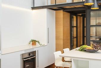 En la planta baja las vigas de madera y las paredes de ladrillo visto pintado de blanco, conviven con estructuras metálicas de las puertas de cristal correderas y el suelo de la zona de trabajo.