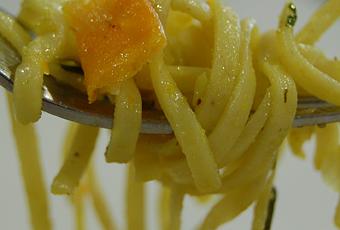Las semillas de cilantro, redonditas, las tengo recogidas de la huerta del año pasado, es muy agradable el olor que desprenden al ponerlas en el mortero y majarlas, y ese aroma es del que se impregna la pasta, junto con el del curry para darle el sabor tan característico de este plato. La pasta que he utilizado es pasta fresca, esta vez no la he hecho yo, la compré en Grossi, y estaba a la altura de siempre.