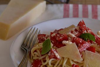 Hoy tomamos un lato de pasta bien fresquito y veraniego, a base de tomates crudos, con los que preparamos una deliciosa salsa conocida como la crudaiola. La vamos a servimos con unos maravillosos espaghetti, unos trozos de queso ricotta y hojas frescas de albahaca. Ahora los tomates se encuentran en su mejor momento, sobre todo si estos han madurado al sol en la mata. Por suerte en Murcia disfrutamos de unos maravillosos tomates, con lo que ha quedado un plato de pasta de lo más sabroso, refrescante y saludable.