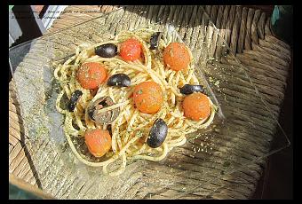 Muchas veces he probado este plato en varios restaurantes y he salido bastante decepcionado..., dejé de pedirlo...Hace unos meses encontré, por casualidad, un blog sobre la pasta, excelente blog, del cual sigo desde sus inicios y desde aquí invito a todo amante de la pasta y de la cocina italiana a seguirlo. El pasado mes de febrero postearon una receta de unos espaguetis que me tienen enamorado y debo decir que es la mejor receta de alla putanesca que he probado. He hecho una versión de esta receta, de la cual solo varía el tipo de tomate (cherry), y la manera de presentarlo. Solo publico la foto del plato de una versión más suave que se comió mi pequeña Júlia, ya que mi blog es de lo más honesto, y eso intento hacer desde mis conocimientos culinarios adquiridos y heredados...