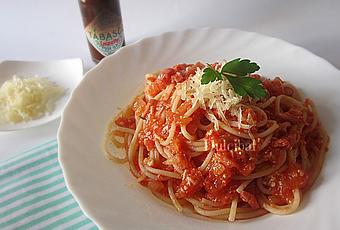 Sigo con un poco de descontrol estos días, a ver si, poco a poco, me voy poniendo al día porque voy de celebración en celebración y esto también agota! Hoy voy a recomendaros esta receta, sencilla y muy rica: "espaguetis a la amatriciana". Supongo que algun@ los desconocerá, como me sucedía a mí hasta que vi esta forma de preparar la pasta en el blog de Gloria. Básicamente, la amatriciana es una salsa italiana (sugo all' amatriciana) para condimentar la pasta, habitualmente los espaguetis (spaghetti). Buscando información he encontrado diferentes variantes a la hora de prepararla aunque lo que caracteriza a esta salsa es que combina puré de tomate natural, panceta, queso pecorino (en la receta original, aunque también se puede utilizar curado de oveja) y tiene un toque (a gusto del comensal) picante ya que suele incorporar cayena, en este caso, yo la he sustituido por Tabasco Chipotle que con su toque ahumado creo que casa a la perfección.