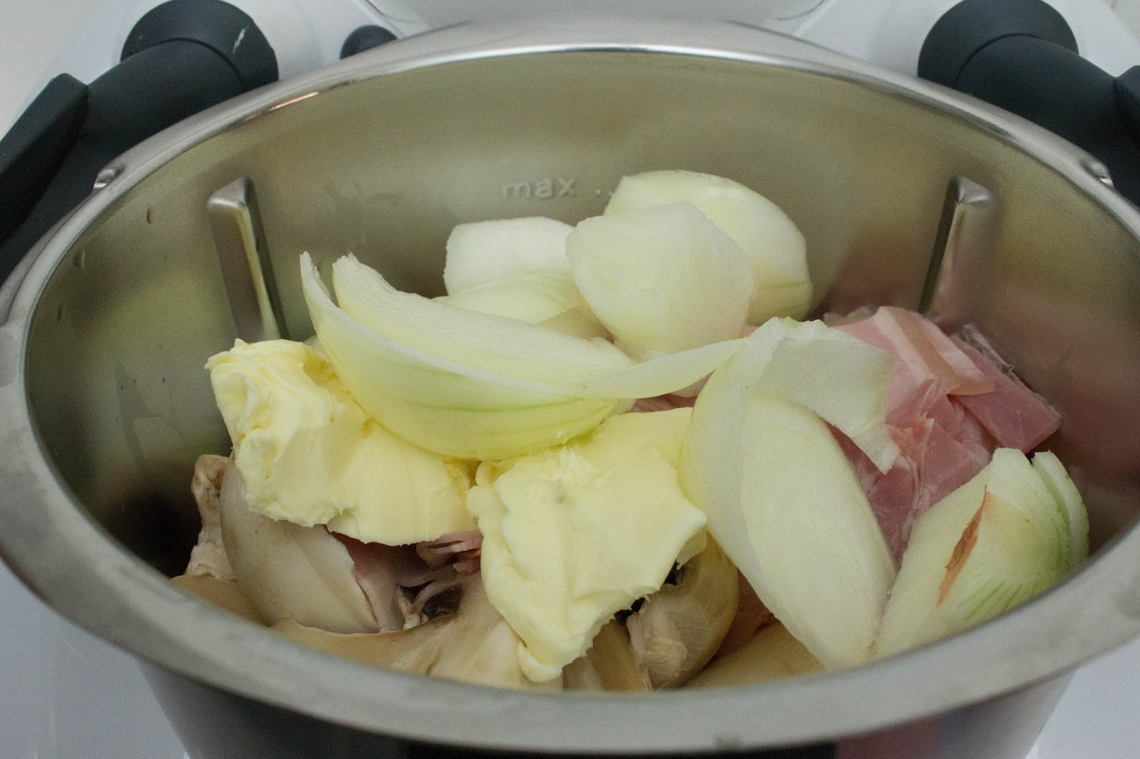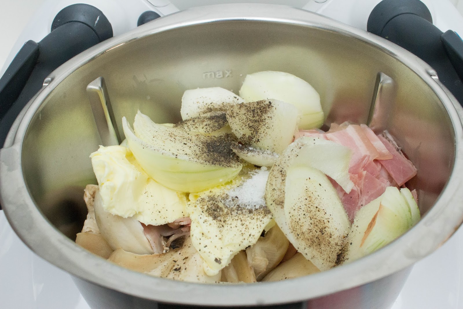 Pon en el vaso de Thermomix la cebolla, la mantequilla, el aceite el bacon, la pimienta y la sal. Tritura 15 segundos a velocidad en velocidad 4. Baja todos los restos de las paredes y programa 7 minutos, temperatura Varoma, giro a la izquierda y velocidad 2.