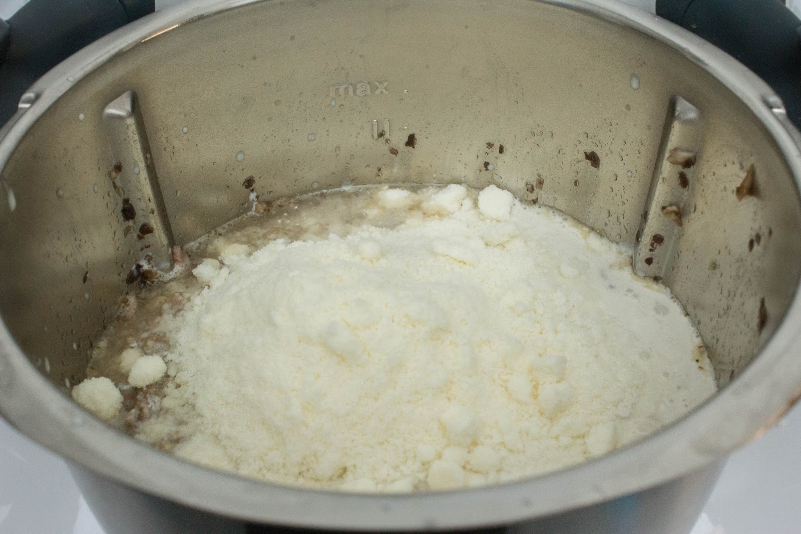 Incorpora la nata de soja y el queso parmesano. Mezcla 5 segundos en velocidad 3, cocina 8 minutos, 90º, giro a la izquierda y velocidad 1.
