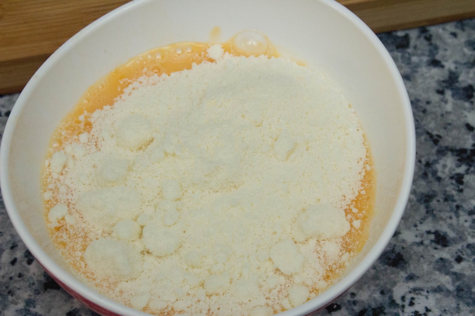 En un cuenco poner los dos huevos, batirlos y añadirle el queso parmesano en polvo. Remover bien con un tenedor.