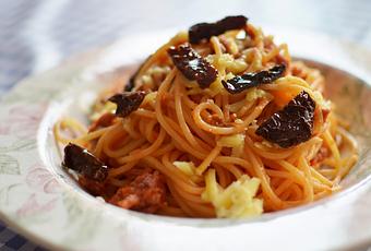 Receta de pasta, todo el mundo sabe hacer pasta. Por un lado cocemos los espaguetis según instrucciones del fabricante. Por otro rehogamos la carne picada junto con los champiñones, el tomate y las especias, para terminar, una vez escurrida la pasta, uniendo todo y presentando en el plato con lascas de queso y los tomates secos partiditos y un chorrito del aceite donde los tenemos envasados. ¡¡Rápido, rico y que a todos nos encanta!!