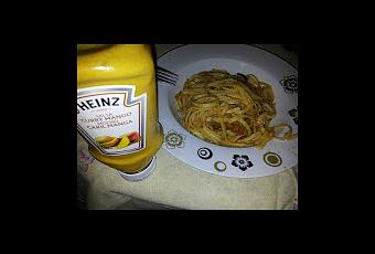 Ese día fui a casa de mi madre a comer, tenía espaguetis y pisto y me dije ¿porque no mezclarlo todo? La verdad es que está realmente rico ya que le da un toque a las verduras del pisto muy especial ya que tiene el picantito con el dulce le va genial. En cuanto a los espaguetis, le va bien todo. La salsa Heinz curry y mango os la recomiendo 100%