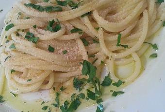 200 gr. de espaguetis, 1 diente de ajo, guindilla/picante, perejil, pan rallado, sal y aceite.