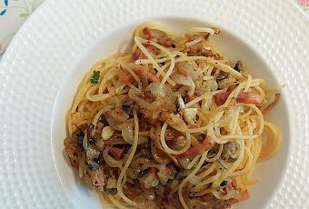 En este caso unas tiras de beicon salteadas, una cebolla dulce y unos ajos sofrítos, alcaparras y albahaca picada... y listo.